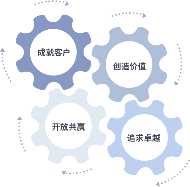 成就客户是一切决策的出发点,,,,创造价值是衡量所有工作的标准,,追求卓越是我们做事做人的态度,,,开放共赢是我们的格局也是最终的结果。。。。价值观的齿轮环环相扣,,,推动着组织里的每个人不断向前。。。